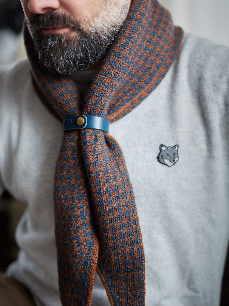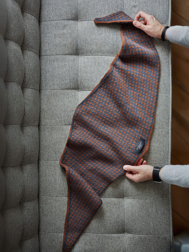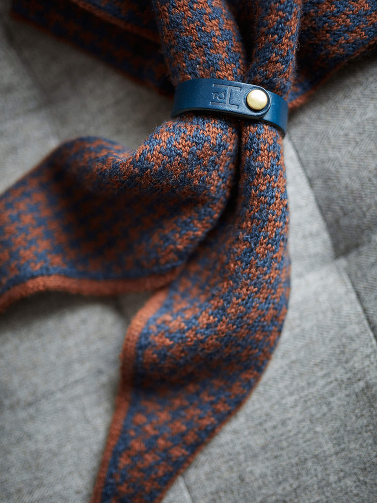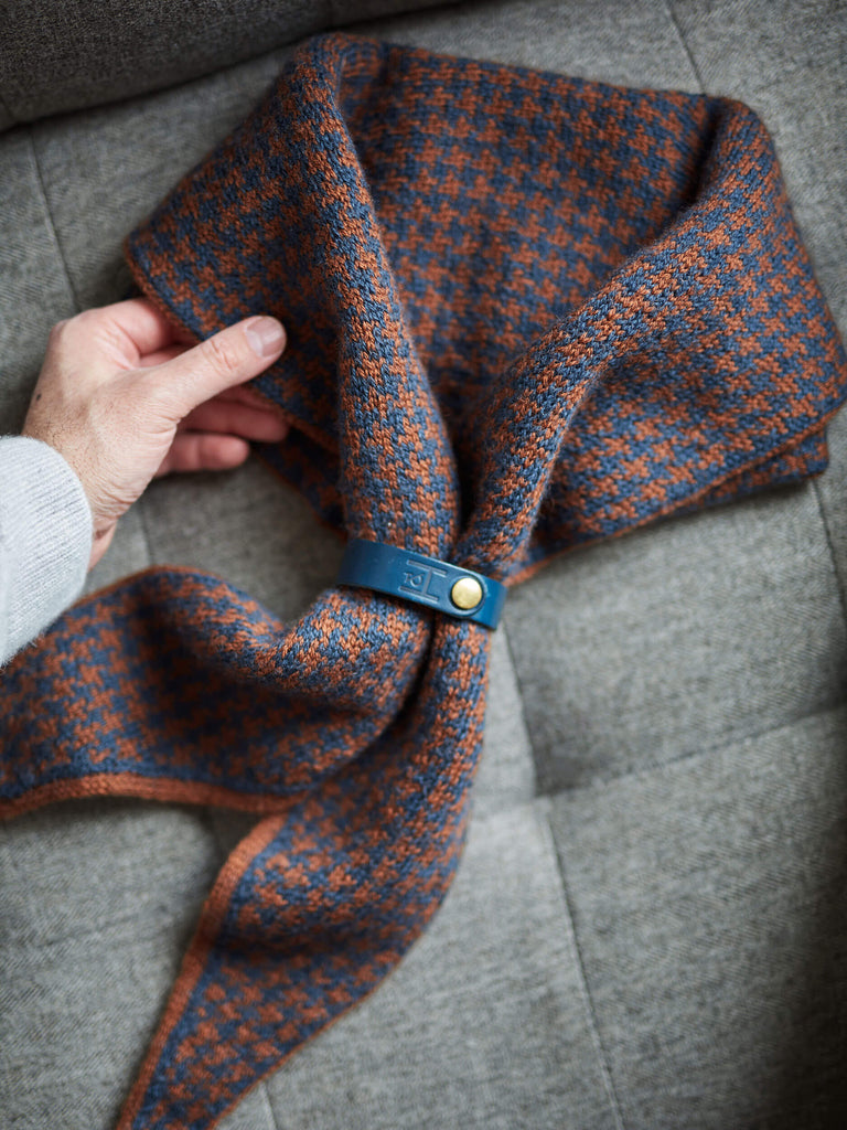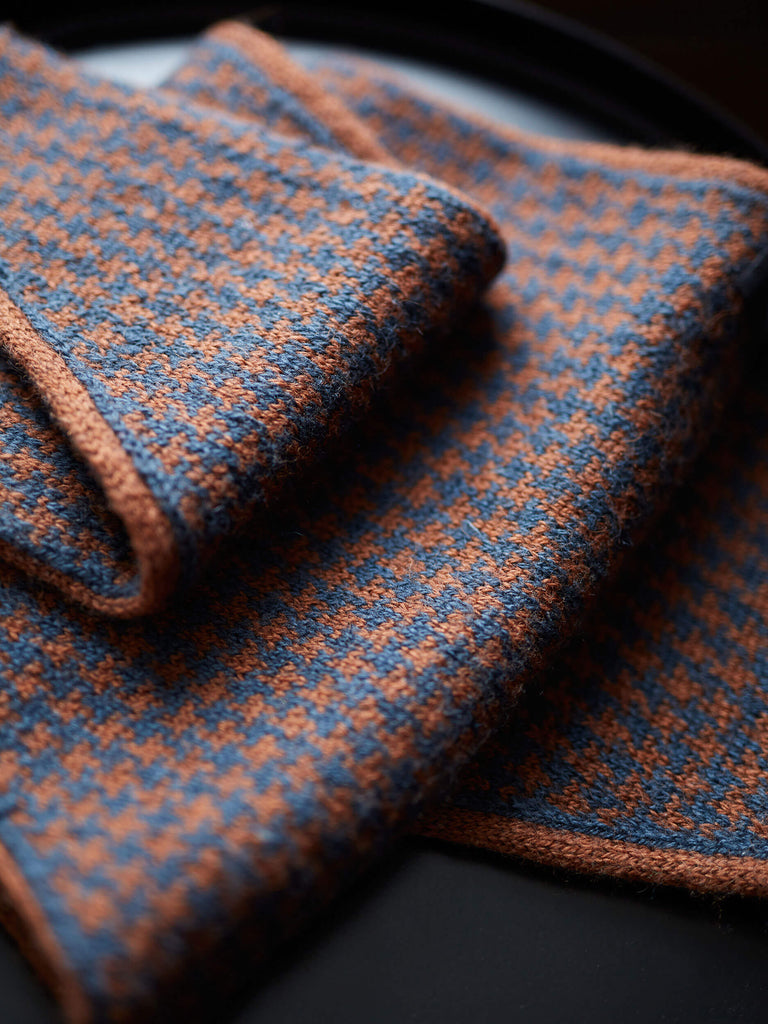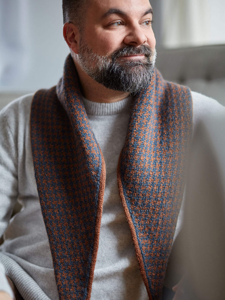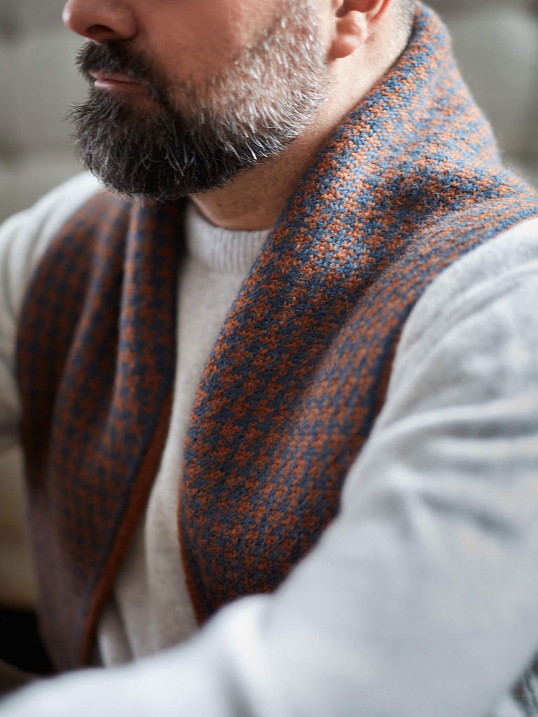 The Huxley scarf features a classic houndstooth motif worked using stranded colourwork. It is knitted in the round, making it fully reversible. Increases are worked to the left of each side, gradually shaping the piece into a distinctive diamond-shaped scarf that drapes elegantly when worn. The Huxley scarf is a graphic yet timeless accessory, both engaging to knit and striking to wear.