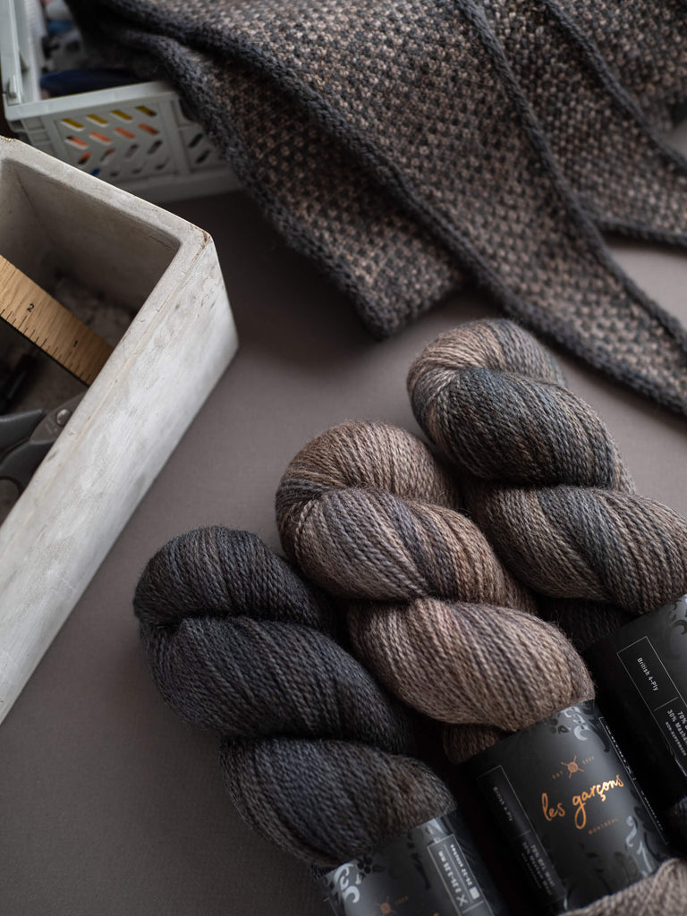 The kit includes the following colourways in the required quantities on British 4-Ply from Les Garçons. The pattern is not included; it is available in our shop or on Ravelry.