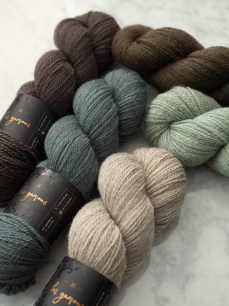 The kit includes the following colourways in the required quantities on British 4-Ply from Les Garçons. The pattern is not included; it is available on Ravelry.