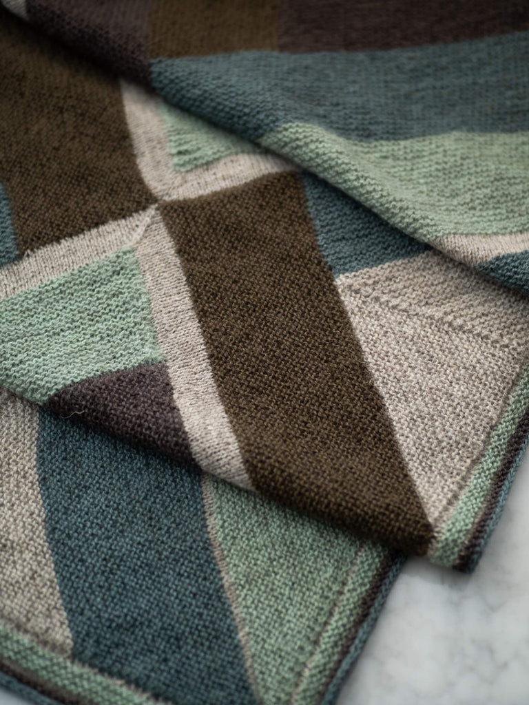 Travel Mode 2.0 by Susanne Sommer, who also goes by the designer name sosu, is a graphic rectangular shawl with a seamless modular construction that creates a herringbone pattern mirrored along a centre panel. The shawl is knitted in garter stitch with stockinette details, and finished with an i-cord border. We’ve assembled these bundles to get you started, but don’t hesitate to mix the colours up; the pattern lets you play with your colours however you like!