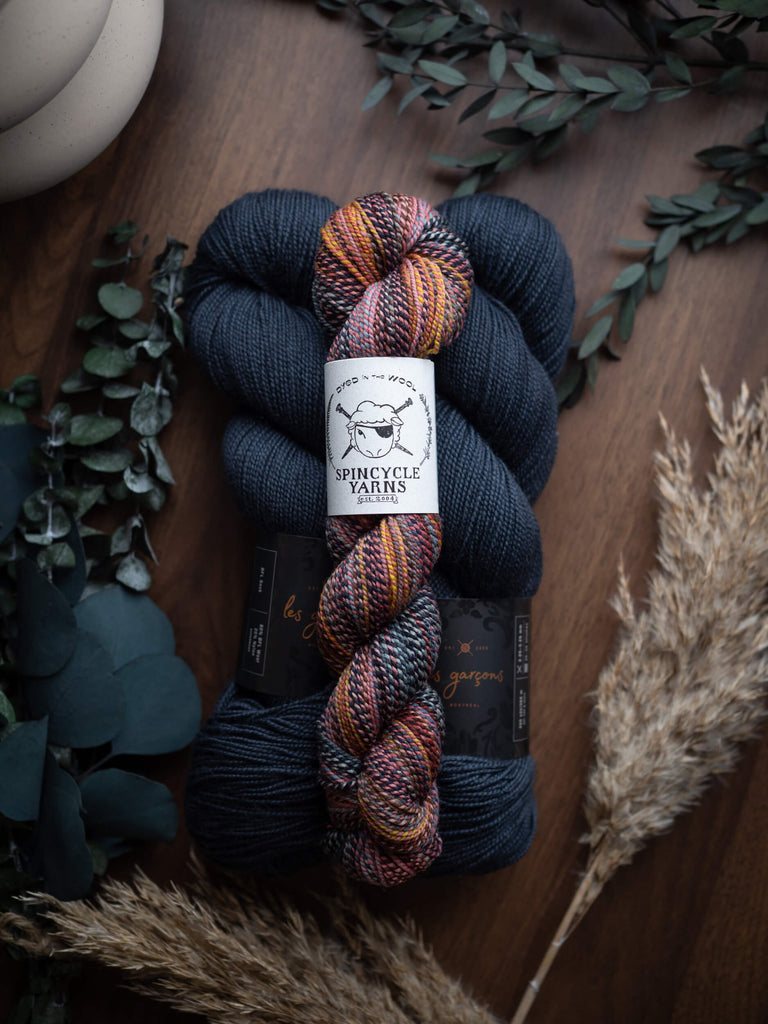 The kit includes the following colourways in the required quantities on BFL Sock from Les Garçons and in Dyed in the Wool from Spincycle Yarns. The pattern is not included; it is available in our shop or on Ravelry.