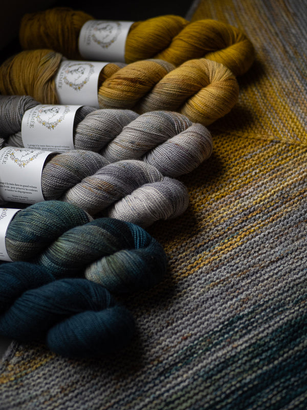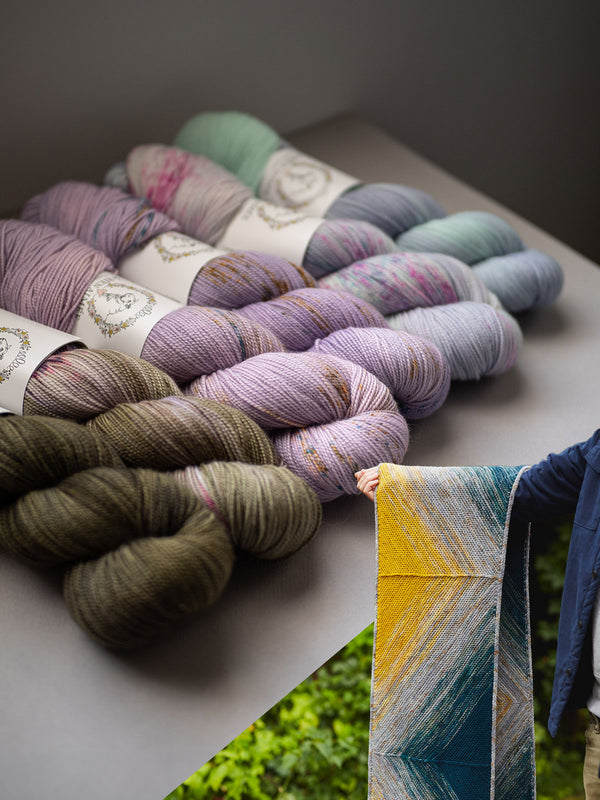 Echoes by Les Garçons is a scarf that features a modular construction, creating faded triangles that echo each other. The gorgeous fade is obtained quite easily by holding two strands of Twist Nouveau from La Bien Aimée. The combination of the construction and the fading colours makes for an easy yet rhythmic and enjoyable project.