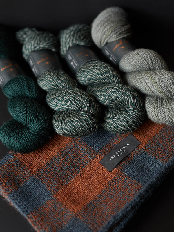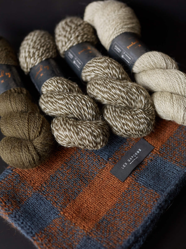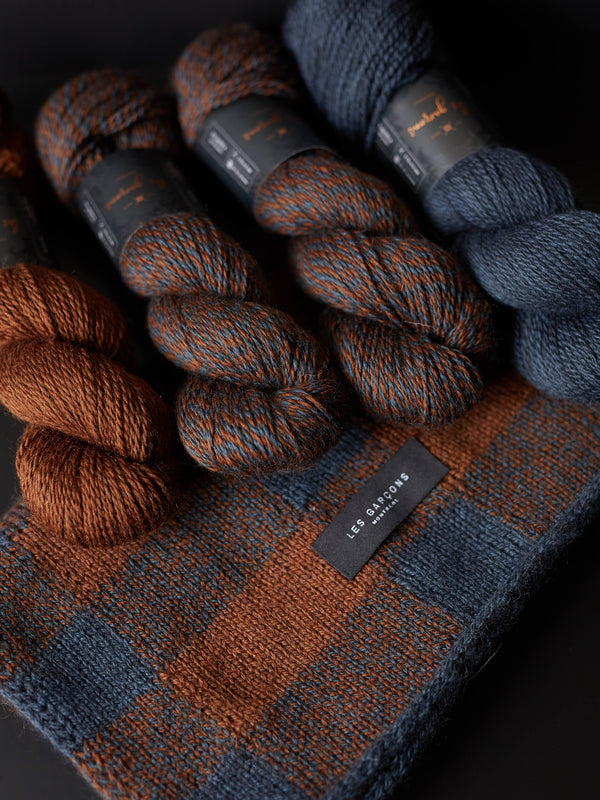 The Rustic Cabin Scarf is a cosy, modern design featuring clean intarsia colourwork and a sleek i-cord edge. By using a marl, such as a British DK marled colourway from Les Garçons, and the corresponding solid colourways, you can create a gingham motif that is reminiscent of a woven fabric.