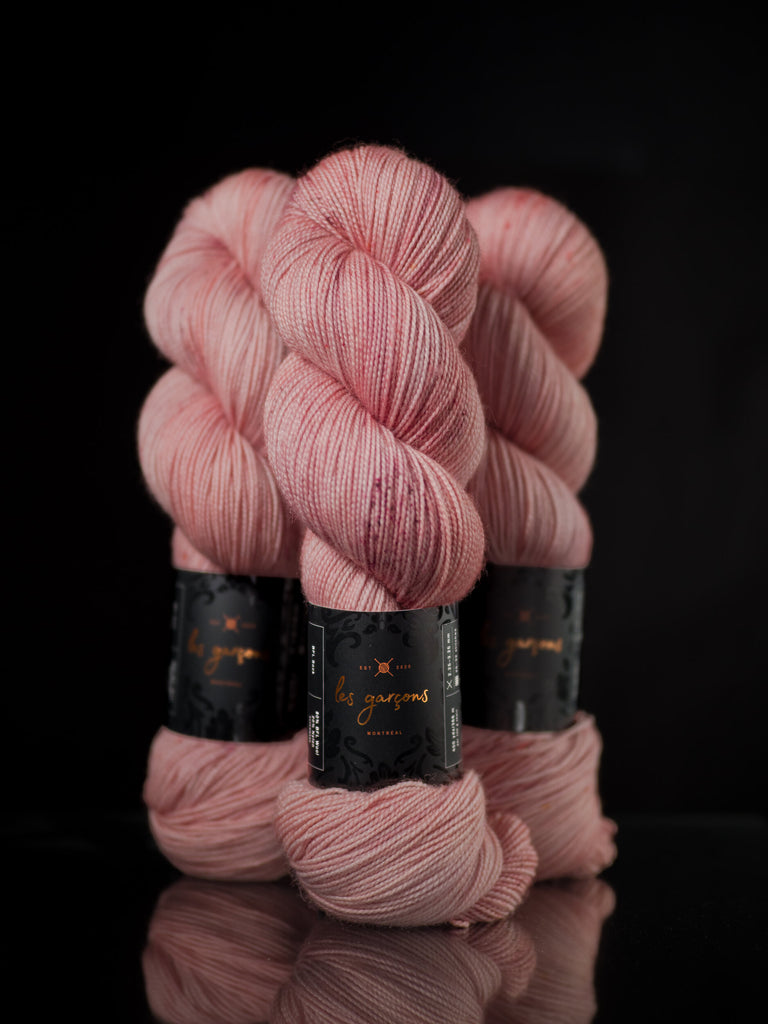 The Les Garçons BFL Sock base is a 2-ply, BFL-nylon blend. It is strong, yet soft. Its high twist gives it bounce and durability.