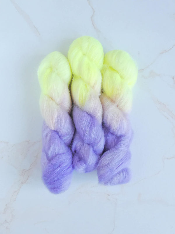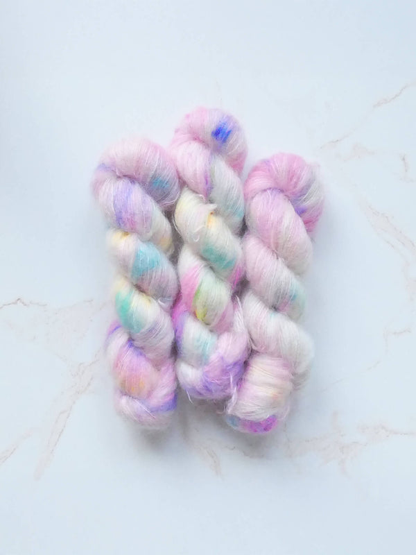 The Wandering Flock's Mohair Lace is a lace-weight wonder that combines super kid mohair (the finest grade of mohair) with a sturdy silk core. With a higher mohair-to-silk ratio than most, it soaks up dyes and speckles beautifully, giving vibrant colour and extra fluff per inch! Perfectly cloud-soft, it is made for garments you will love to wear close to your skin. Use it solo with a wide gauge for an airy sweater, or hold it with a fingering or a DK weight yarn to add a whisper of colour and a dreamy halo to your projects.