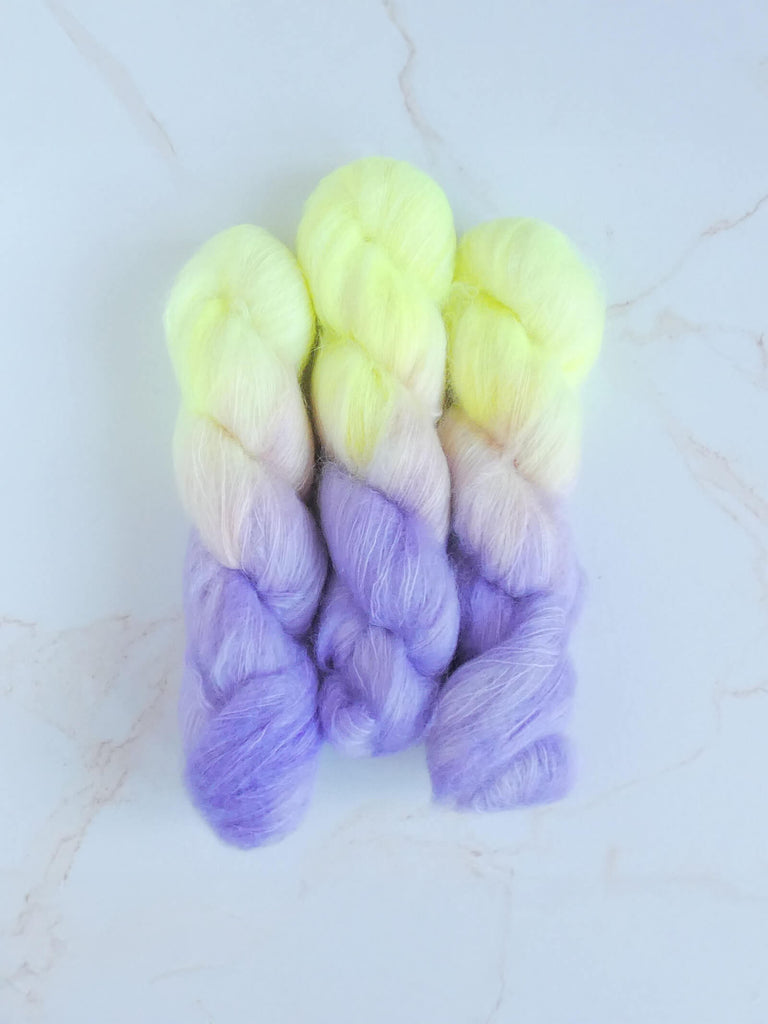 The Wandering Flock's Mohair Lace is a lace-weight wonder that combines super kid mohair (the finest grade of mohair) with a sturdy silk core. With a higher mohair-to-silk ratio than most, it soaks up dyes and speckles beautifully, giving vibrant colour and extra fluff per inch! Perfectly cloud-soft, it is made for garments you will love to wear close to your skin. Use it solo with a wide gauge for an airy sweater, or hold it with another yarn to add a whisper of colour and a dreamy halo to your projects.