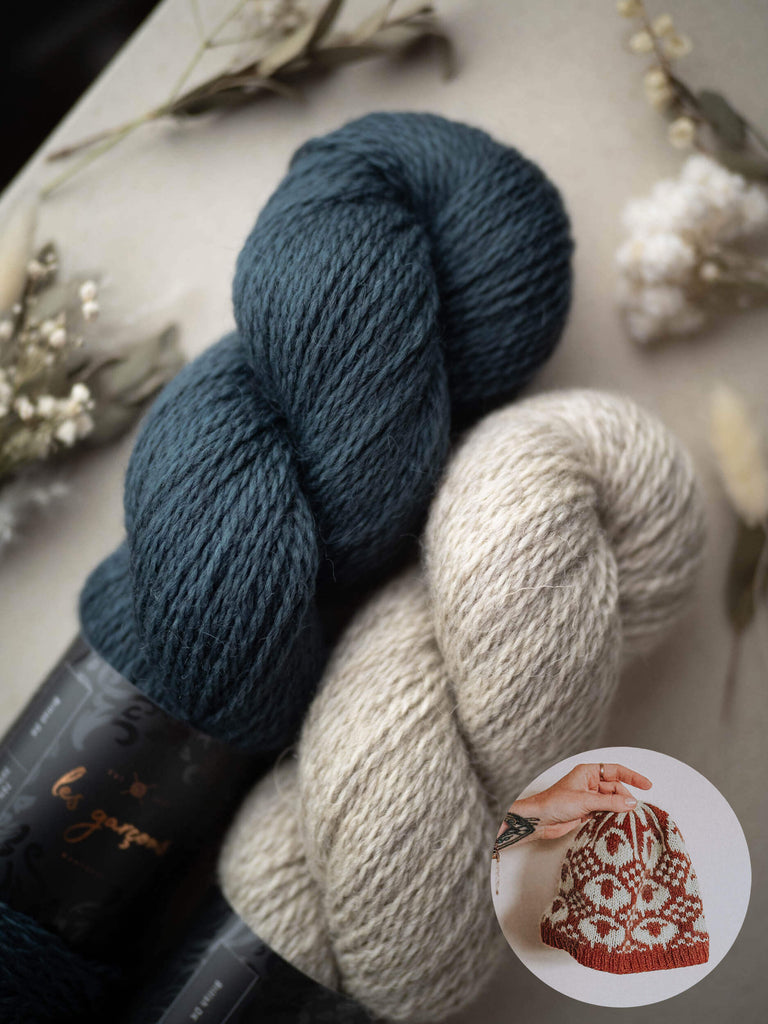The kit contains the following colourways in the required quantities on British DK from Les Garçons. The pattern is not included; it is available on Ravelry.