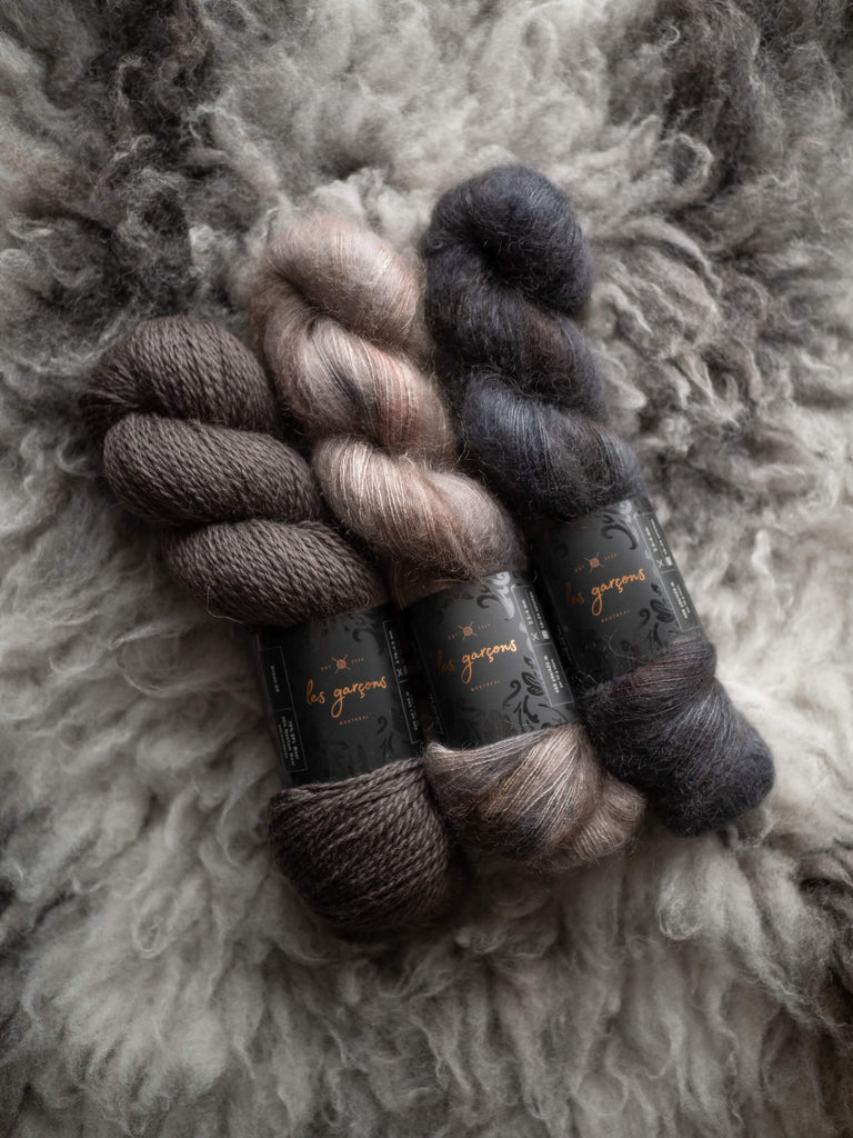 Le kit contient les coloris suivants dans les quantités requises sur les fils British DK et Mohair Silk de Les Garçons. Le patron n’est pas inclus; vous pouvez vous le procurer dans notre boutique ou sur Ravelry.