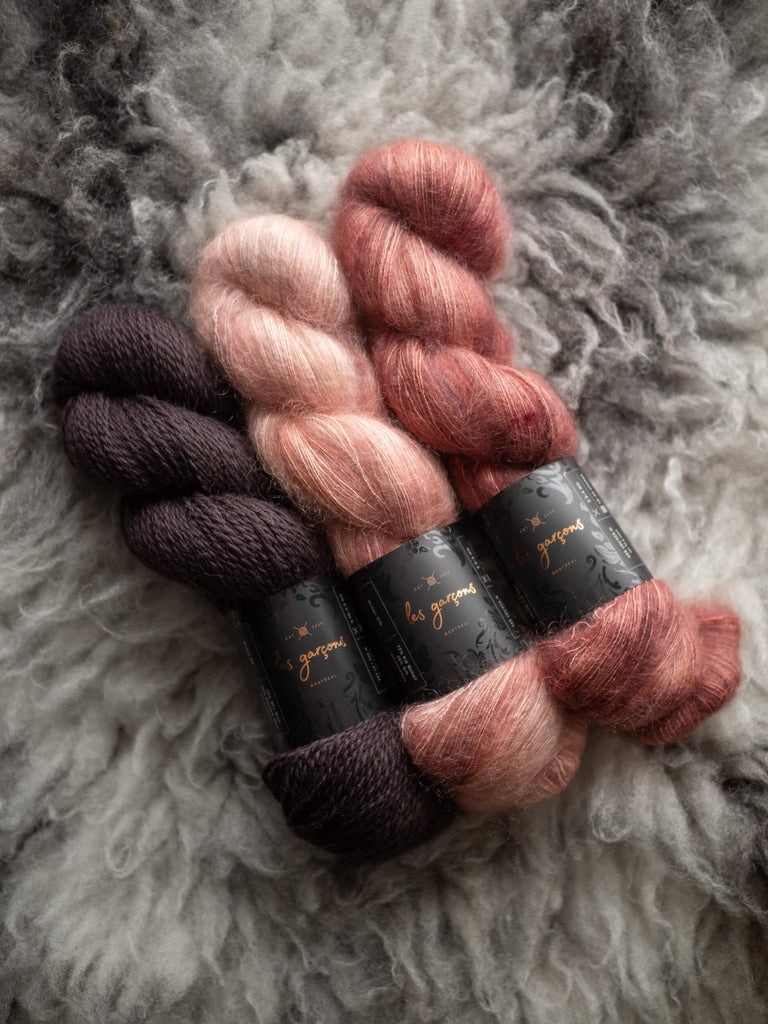Le kit contient les coloris suivants dans les quantités requises sur les fils British DK et Mohair Silk de Les Garçons. Le patron n’est pas inclus; vous pouvez vous le procurer dans notre boutique ou sur Ravelry.