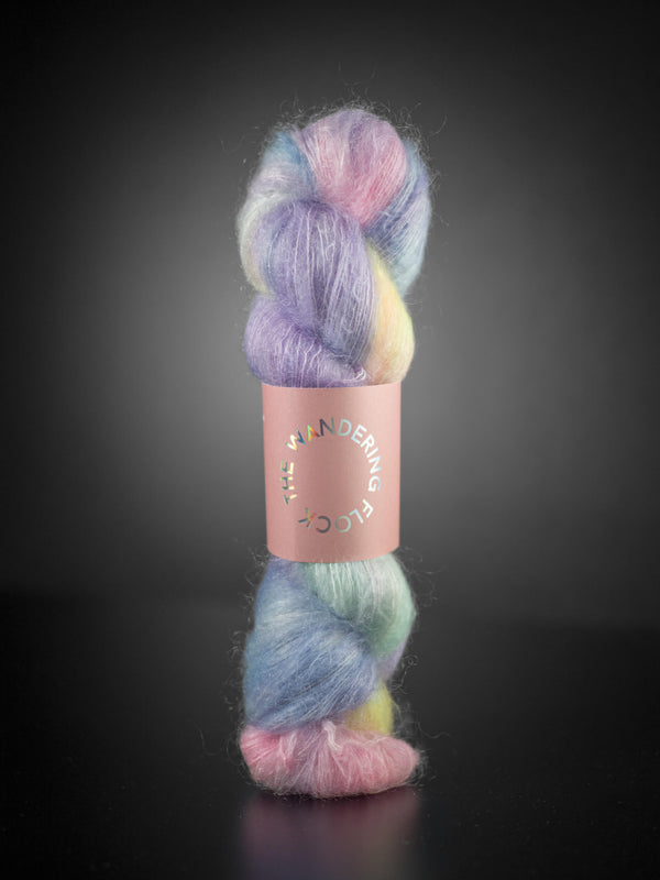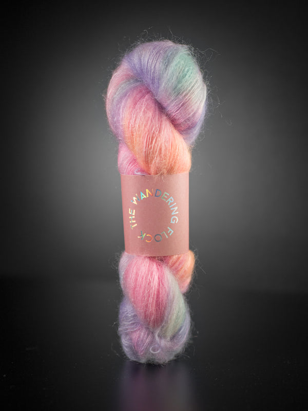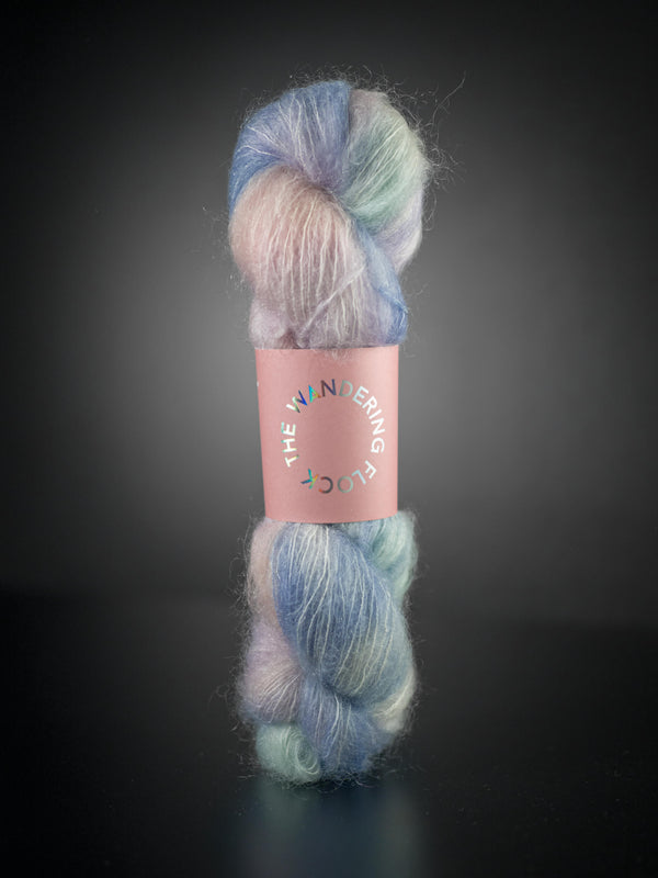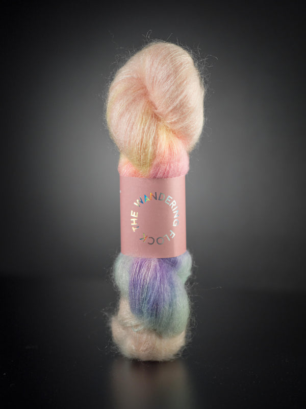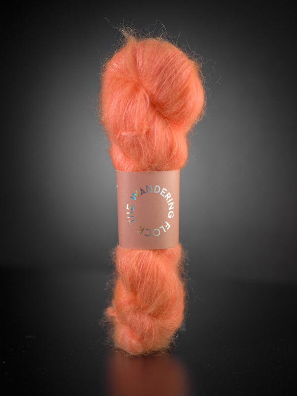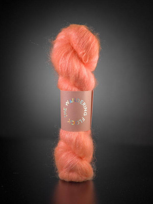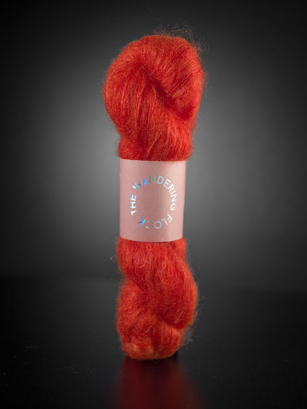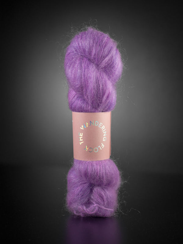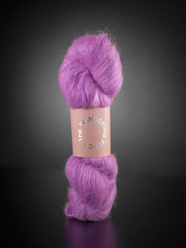 Le fil Mohair Lace de The Wandering Flock est un merveilleux fil dentelle qui associe le très jeune mohair (la qualité la plus fine de mohair) à une âme en soie. Avec un ratio mohair-soie plus élevé que la plupart des fils semblables, il absorbe magnifiquement les pigments, offrant des couleurs vibrantes et un supplément de « fluff » à chaque centimètre tricoté! D'une douceur incomparable, il est parfait pour des vêtements que vous adorerez porter directement sur votre peau. Utilisez-le seul avec une tension lâche pour créer un pull léger et aérien, ou associez-le à un autre fil pour ajouter une touche de couleur subtile et une aura vaporeuse à vos projets.