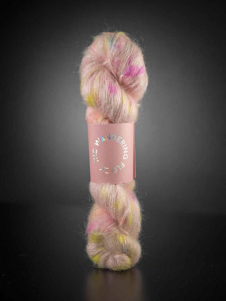 Le fil Mohair Lace de The Wandering Flock est un merveilleux fil dentelle qui associe le très jeune mohair (la qualité la plus fine de mohair) à une âme en soie. Avec un ratio mohair-soie plus élevé que la plupart des fils semblables, il absorbe magnifiquement les pigments, offrant des couleurs vibrantes et un supplément de « fluff » à chaque centimètre tricoté! D'une douceur incomparable, il est parfait pour des vêtements que vous adorerez porter directement sur votre peau. Utilisez-le seul avec une tension lâche pour créer un pull léger et aérien, ou associez-le à un autre fil pour ajouter une touche de couleur subtile et une aura vaporeuse à vos projets.