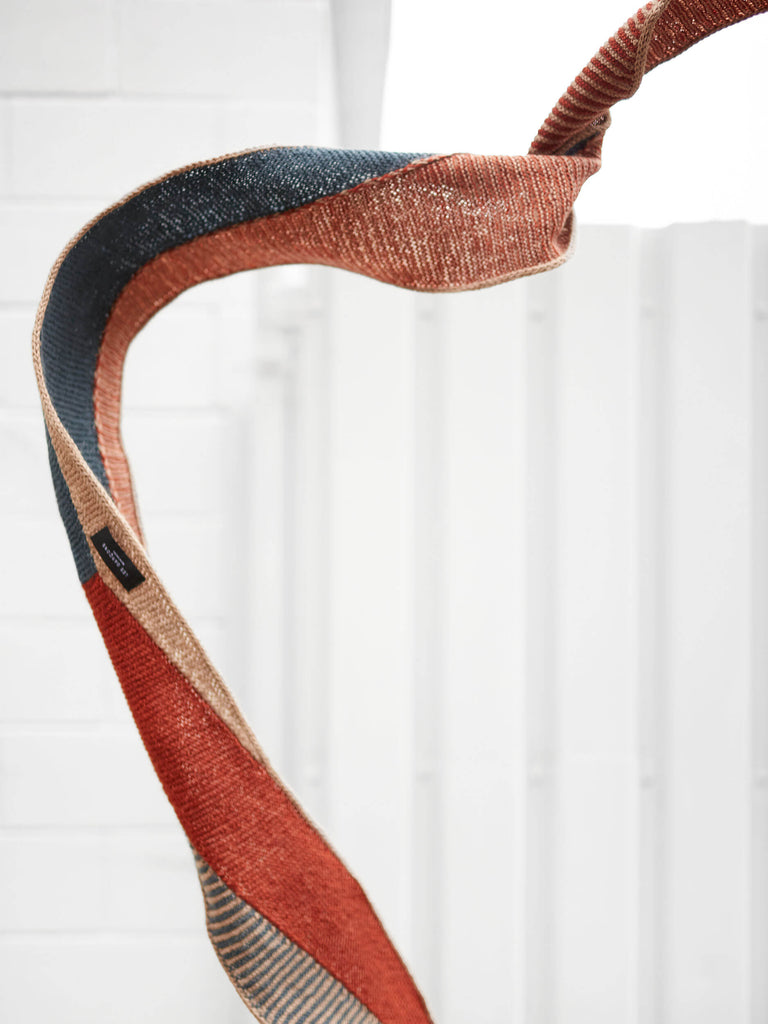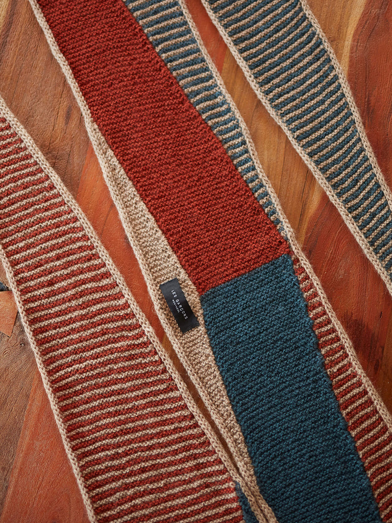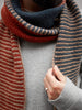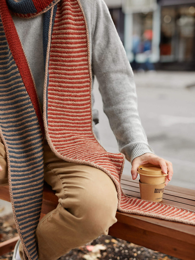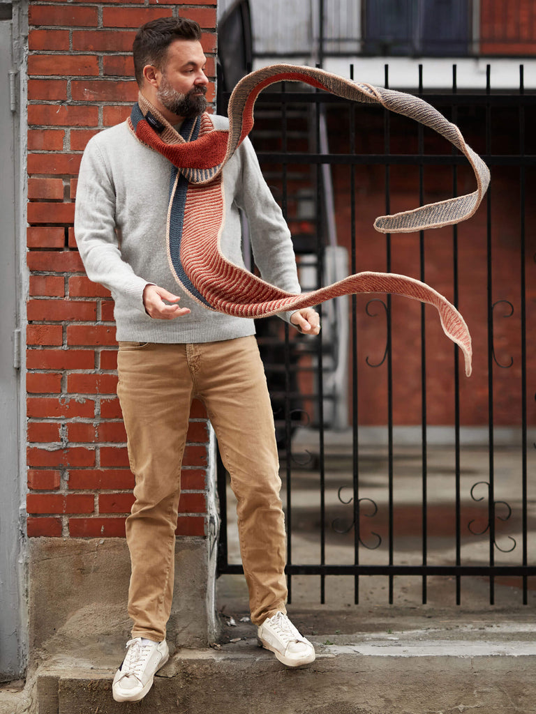 Avec sa construction inhabituelle, l’écharpe Rocketeer est un modèle modulaire où les formes angulaires s’assemblent de manière autant ludique que sophistiquée. Le patron commence par deux longs triangles rayés qui sont assemblés pour créer la forme caractéristique du modèle. À partir de ce point, le reste de l’écharpe est tricoté un bloc à la fois.