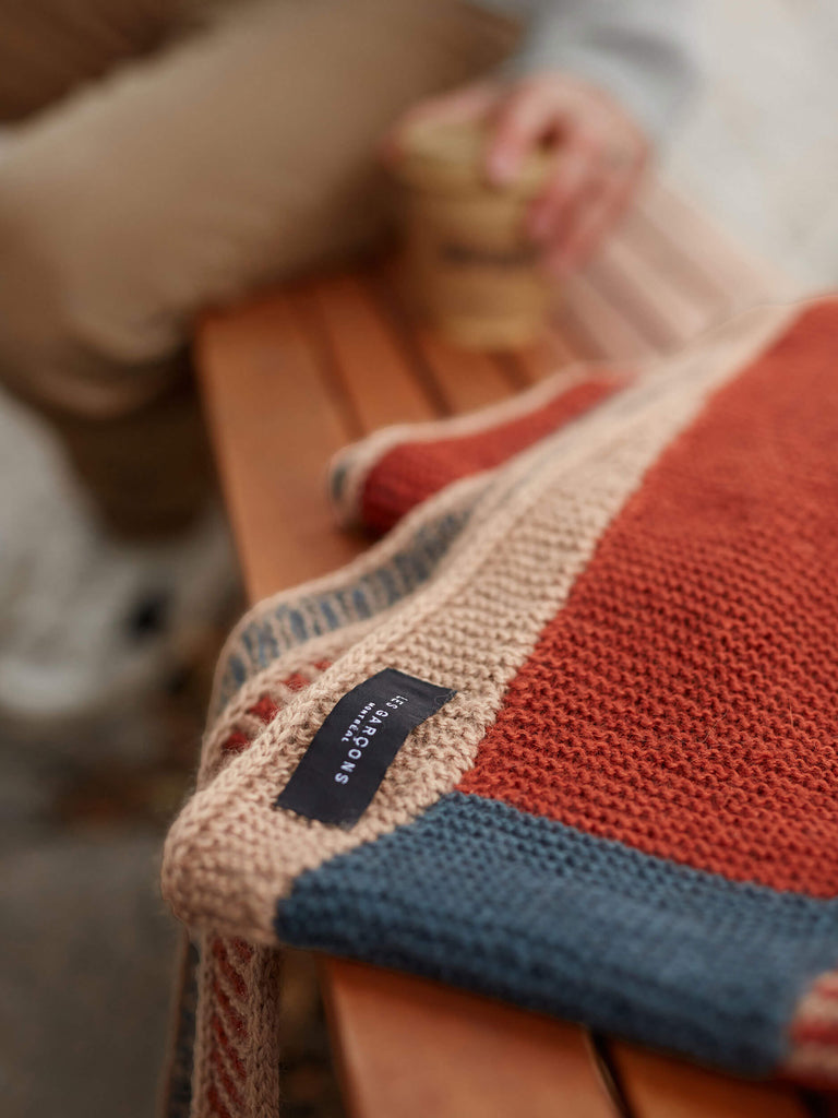 L’échantillon est tricoté avec la British DK de Les Garçons (70 % laine de bluefaced leicester, 30 % laine de masham, fil non traité; 240 m / 263 vg par écheveau de 100 g), dans les coloris « Édith’s Butler » (couleur A), « Twyla’s Sand » (couleur B) et « Aleks’s Red Squirrel Friend » (couleur C).