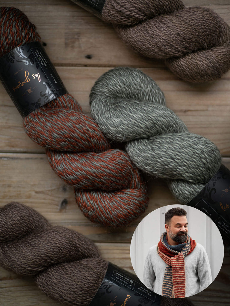 The kit includes the following colourways in the required quantities on British DK from Les Garçons. The pattern is not included; it is available in our shop or on Ravelry.